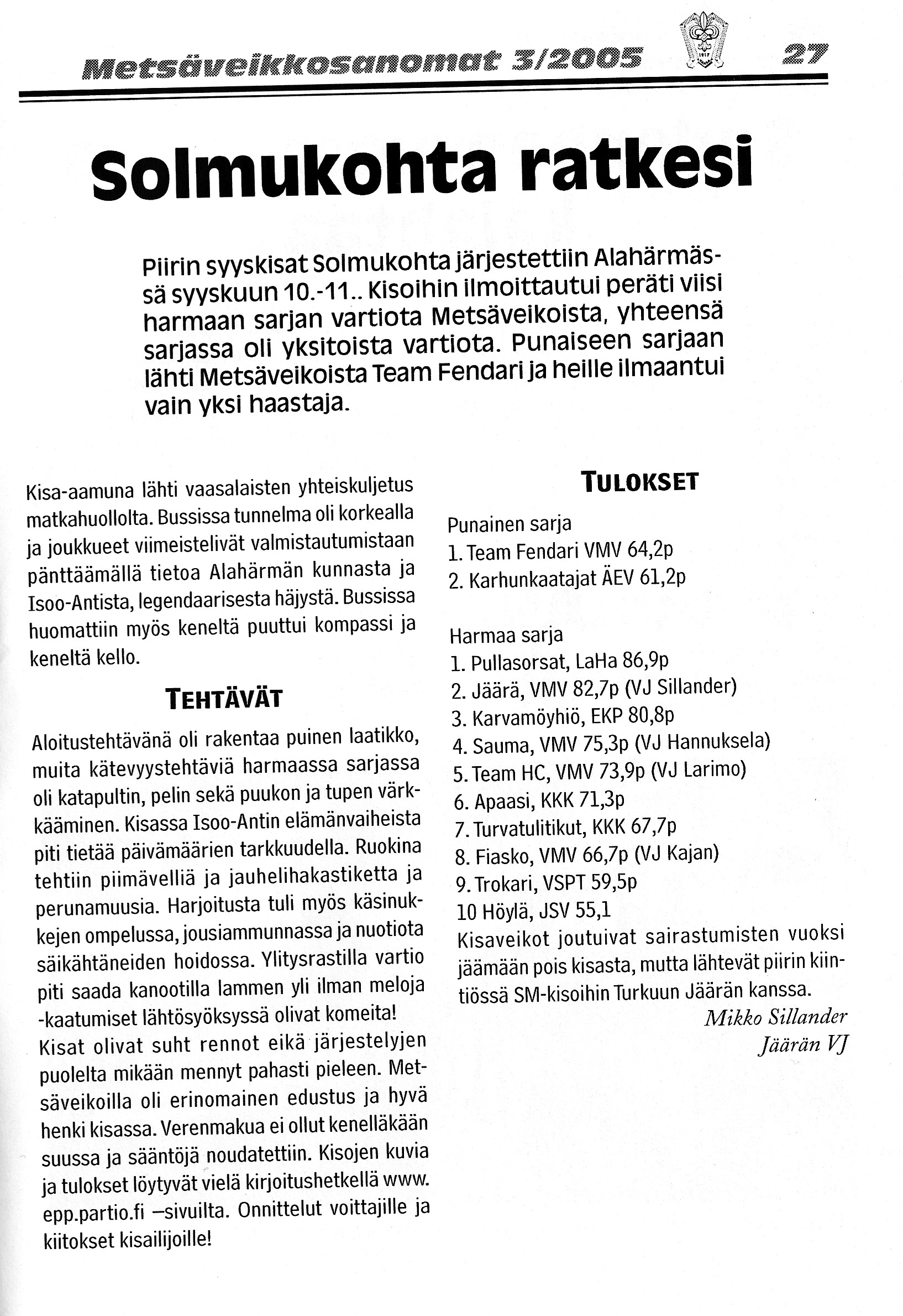 Yritys oli tiukkaa, mutta historialliset paperitehtävät sekä kasviot ja mausteet meni totaalisesti 50/60 osastolle.. Näpräilytehtävistä onnistui ”nuoliviini”, josta napattiin TÄYDET.. Lopullisesti visio korkealle sijoittumisesta mureni yörastin mukana, sillä aika ei riittänyt ja varsijousi jäi osin rakentamatta.. Yllättävästä pulikointi rastista LAUTTA tuli 0,4 pistettä vaille täysosuma.. EAh lyhyt juttu kisoista MV-sanomissa 3/06 löytyy täältä. (kuvia ei ole, koska kisan järjestäjät eivät ole niitä saaneet nettiin laitettua?