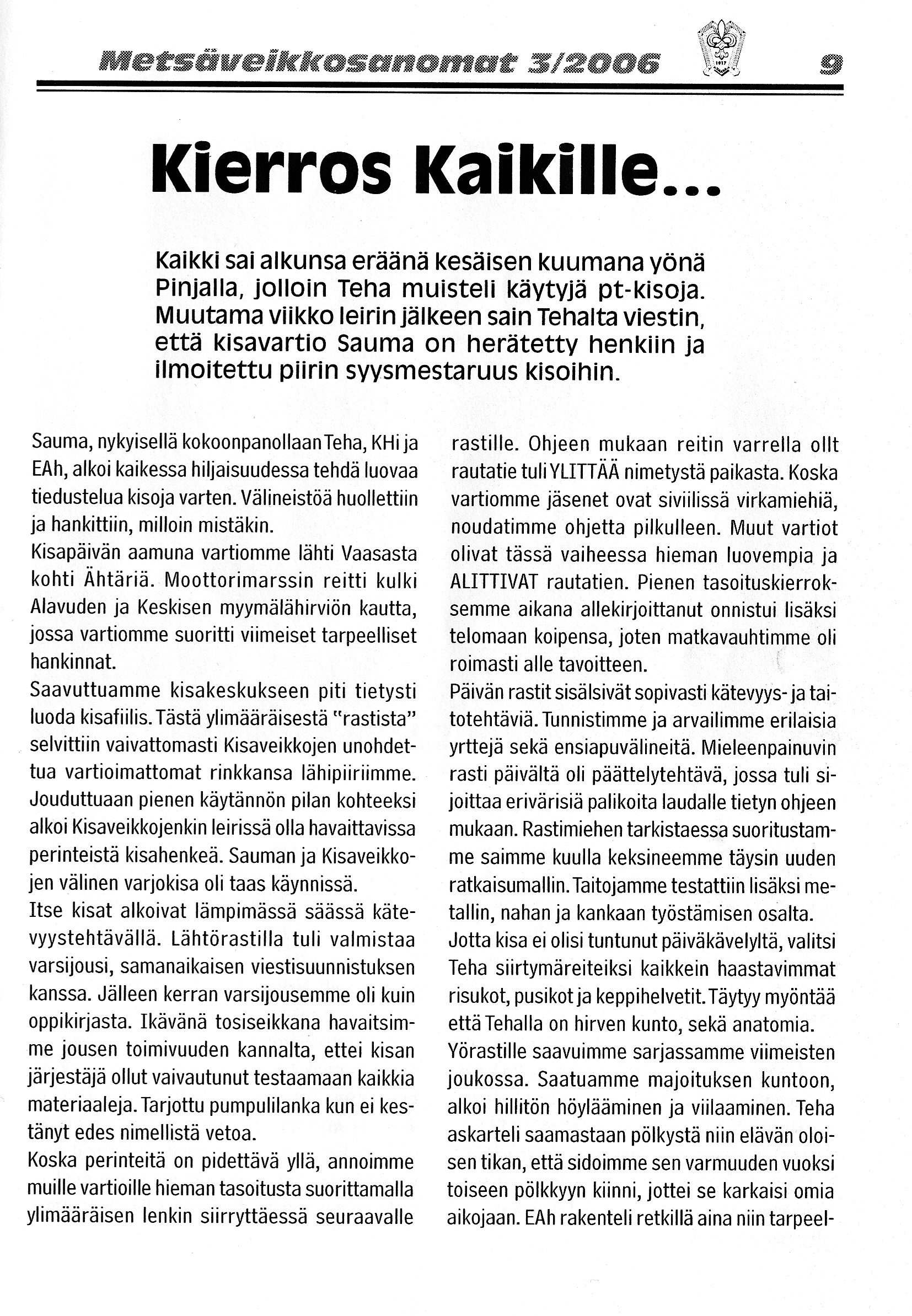 14,5 pisteen kaula 2.sijaan.. Loppupisteillä olisimme sijoittuneet Harmaassa sarjassakin toiselle sijalle.. Näissä kisoissa juostiin mm. Rintahaarniska vartion ohi kiritaipaleella, minkä aikana piti sitoa vartio jaloista yhteen.. Missään ei mainittu, että saako jalat olla irti toisistaan.. Niinpä meillä oli vartionjäsenet kiinni toisissaan yli 5 metrin solmunaruilla.. Antero Matssonin johtamaa Rintahaarniskaa EI juurikaan naurattanut, kun me juosten ohitimme heidän kompastelevan ja tahtia haeskelevan vartion, joka tosin oli Harmaan sarjan edustaja.. Meitä nauratti aika lailla.. =) Yhdet parhaista kisoista, jotka muistetaan myös lypsyjakkarasta, väiskin ompelemisesta ja siitä, että saavuimme yörastille melkein 3 tuntia ennen muita.. =)